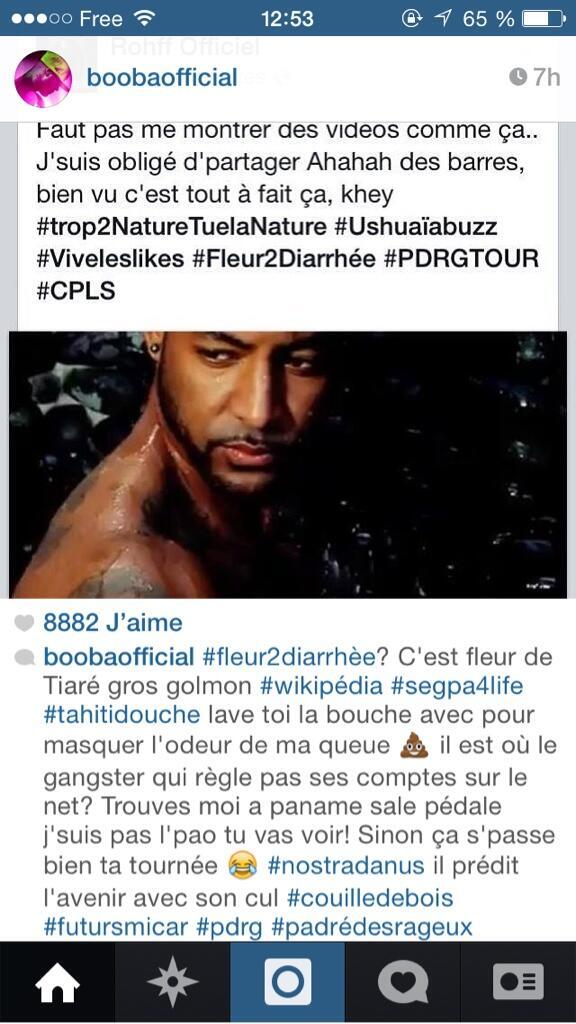 Donc Monsieur Rohff dans sa grande maturité a relancé le clash en parodiant le clip avec un rush Ushuaïa.. Ce qui m’a choqué c’est quand son expert en communication, un certain « Ali Buzz de Fou », lui a conseillé de faire un jeu de mot « Fleur de Tiaré »/ »Fleur de Diarrhée ».
