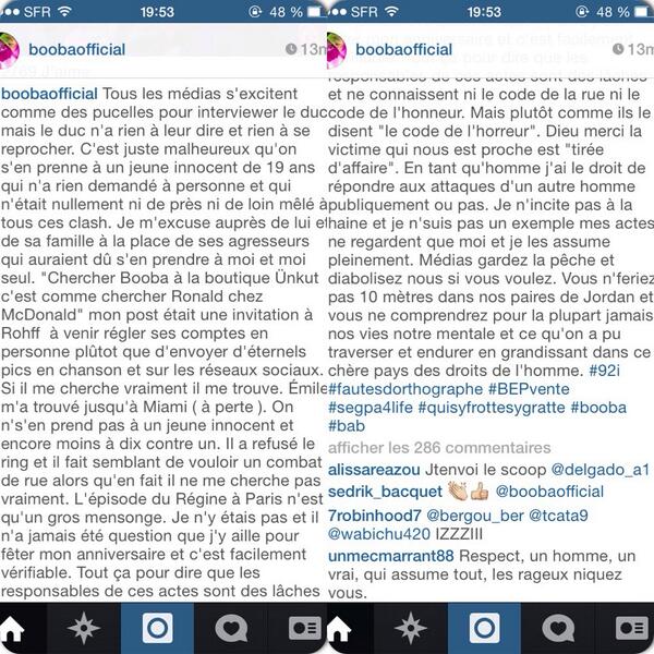 A son tour Ali Buzz de Fou a été entendu pour « Complot » et « Incitation à la violence ». Et Booba a enfoncé le clou en nous qualifiant de « Lâches » dans un long message sur son compte Instagram où, si je puis me permettre, « il était en train d’enculer tout le monde ».